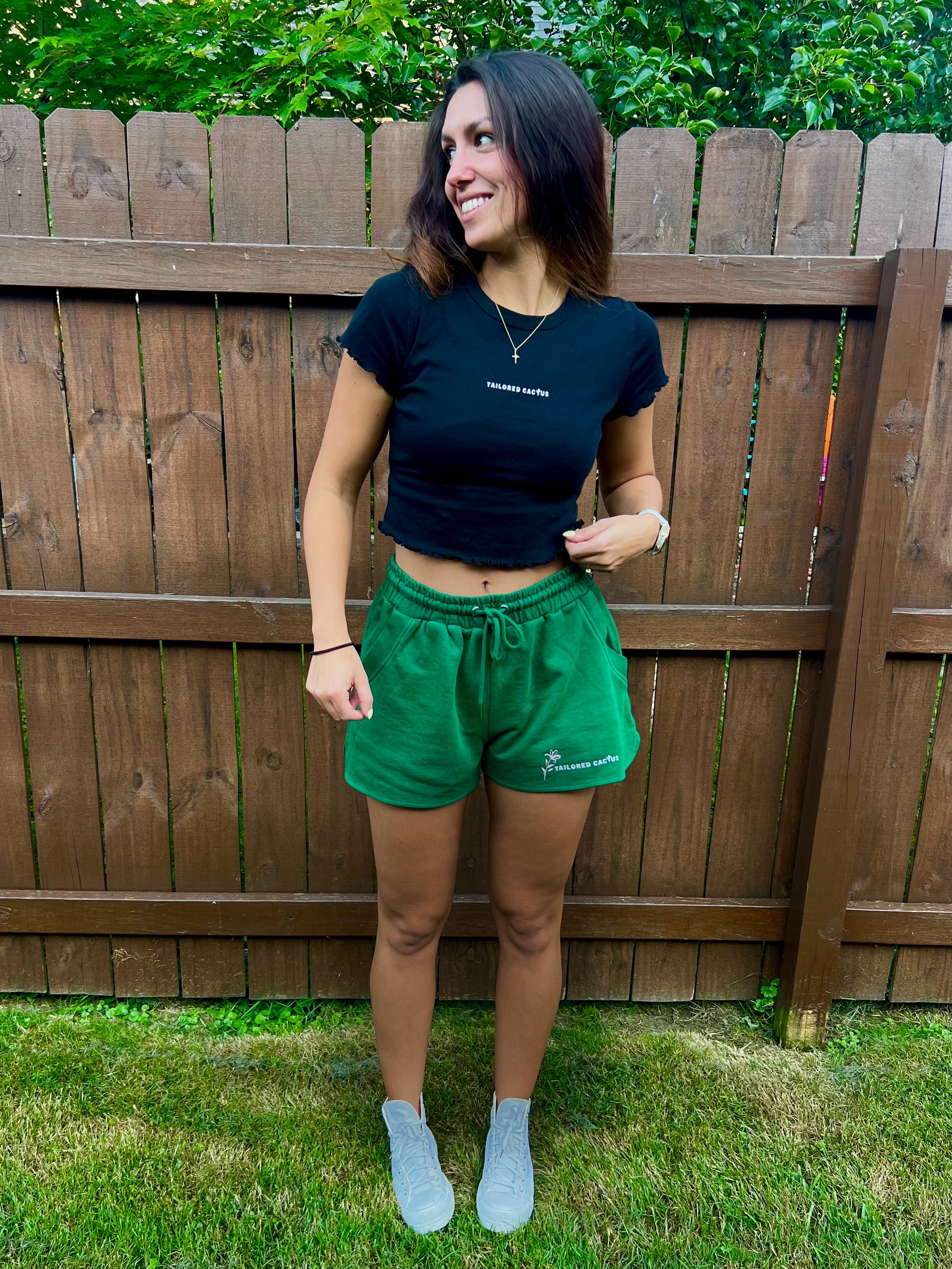 This black baby tee features delicate lettuce-edge hems and a clean white Tailored Cactus logo front and center. Fitted and flattering, it’s perfect for pairing with sweats or your favorite mini skirt. Simple, soft, and effortless.