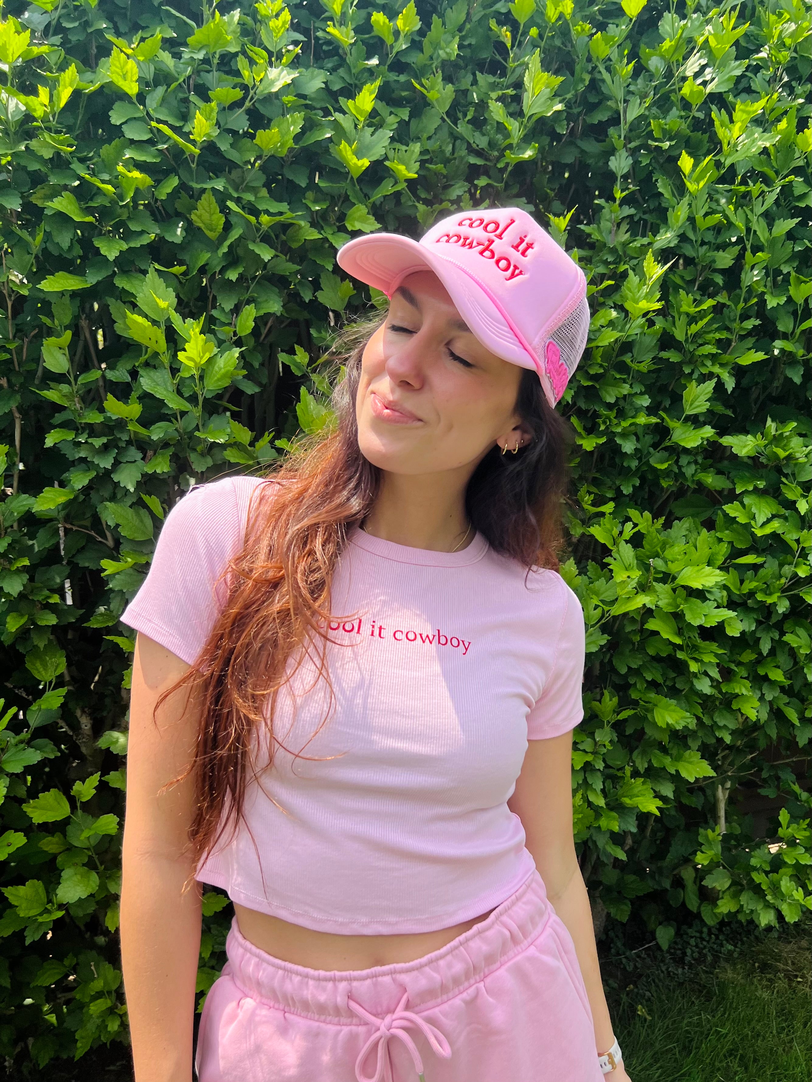 Top off your summer look with the perfect statement piece. This baby pink hat keeps it cool and casual, featuring bold red ‘Cool It Cowboy’ embroidery across the front and a signature Tailored Cactus patch on the side. Made for sunny days and easy style, it’s the finishing touch your outfit needs.
