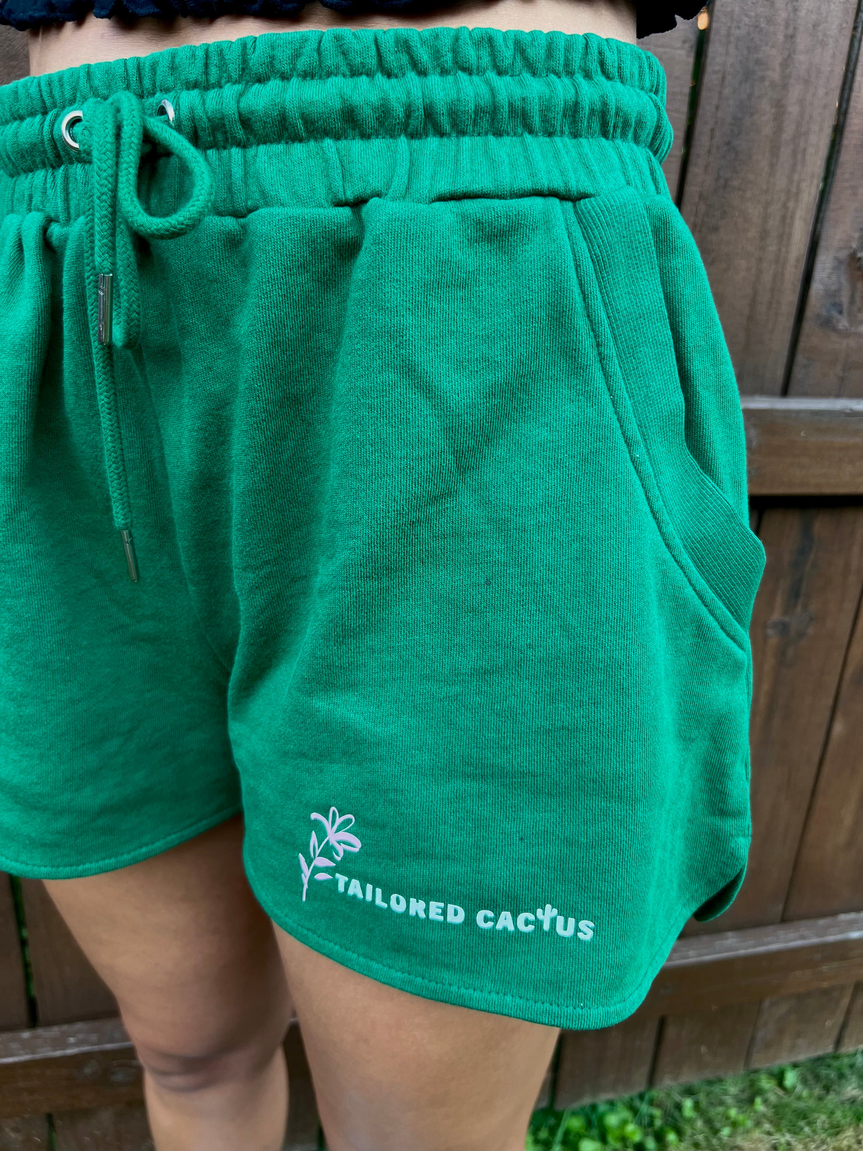Designed to pair perfectly with the zip up jacket, they feature a white Tailored Cactus logo on the left leg and subtle pink floral accents. Whether you're lounging or heading out, these shorts bring effortless cool to any vibe.