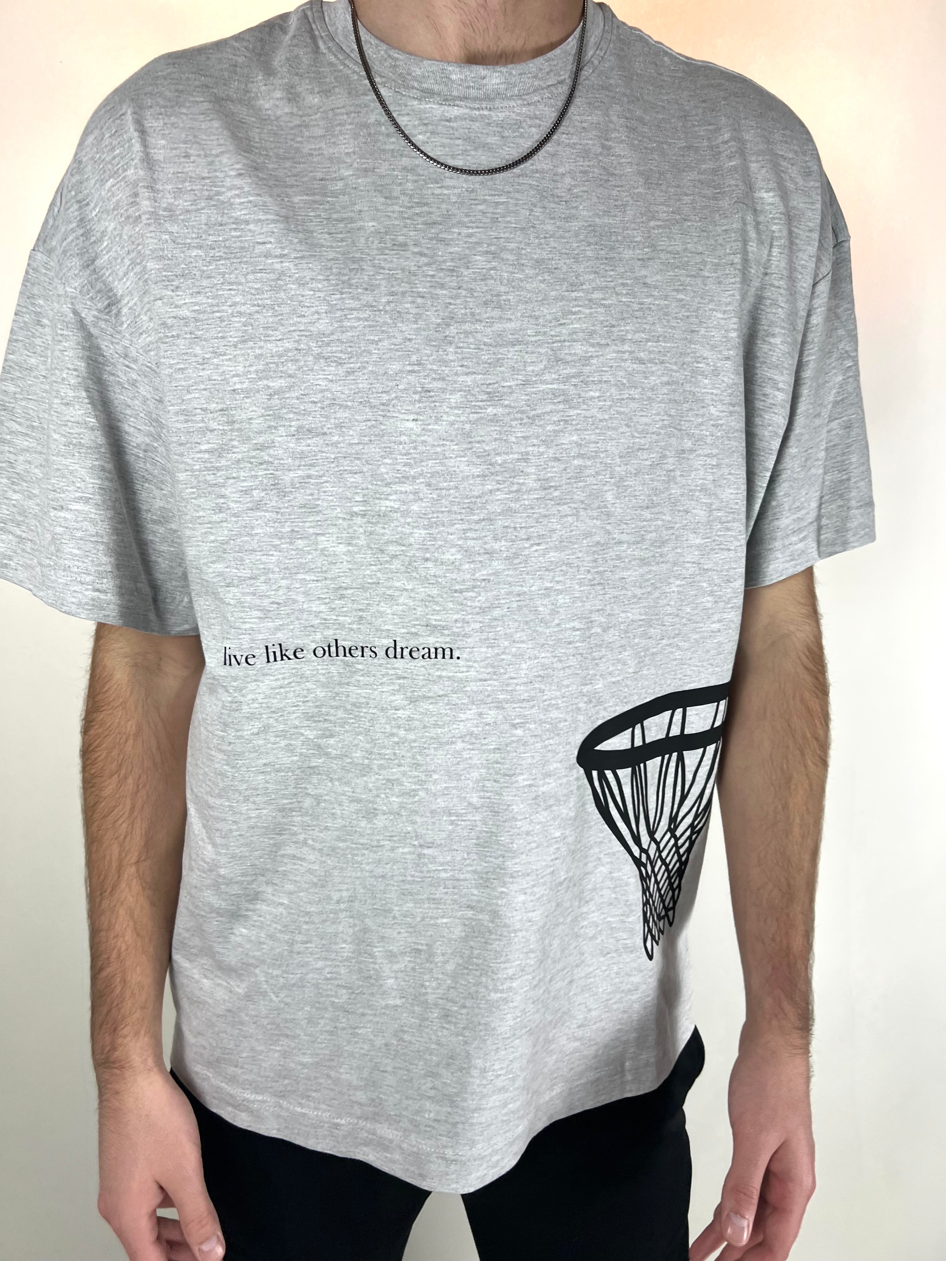 Elevate your everyday style with this grey boxy-fit tee, featuring a bold basketball hoop graphic and the inspiring phrase Live Like Others Dream. Perfect for hoopers and dreamers!