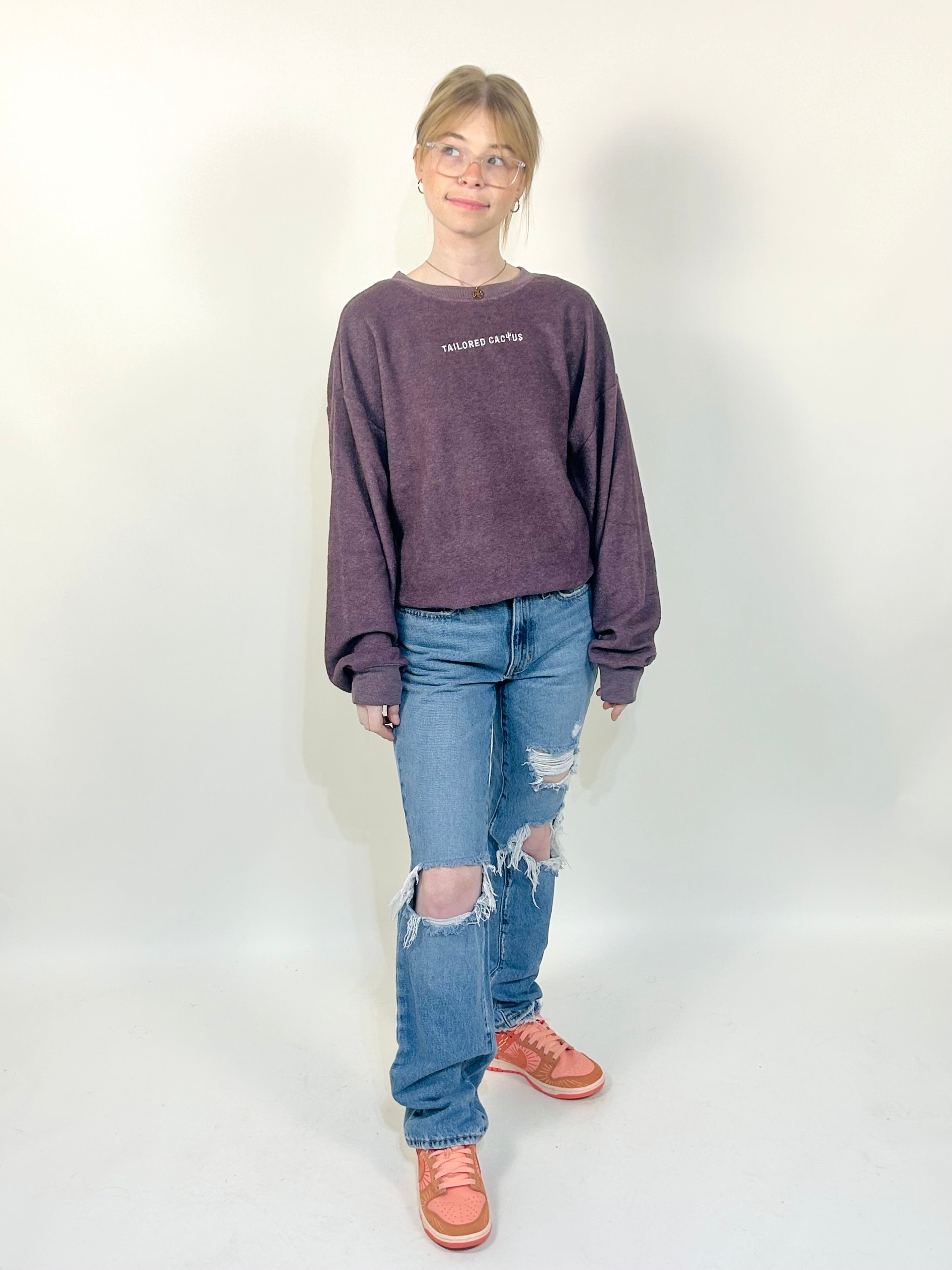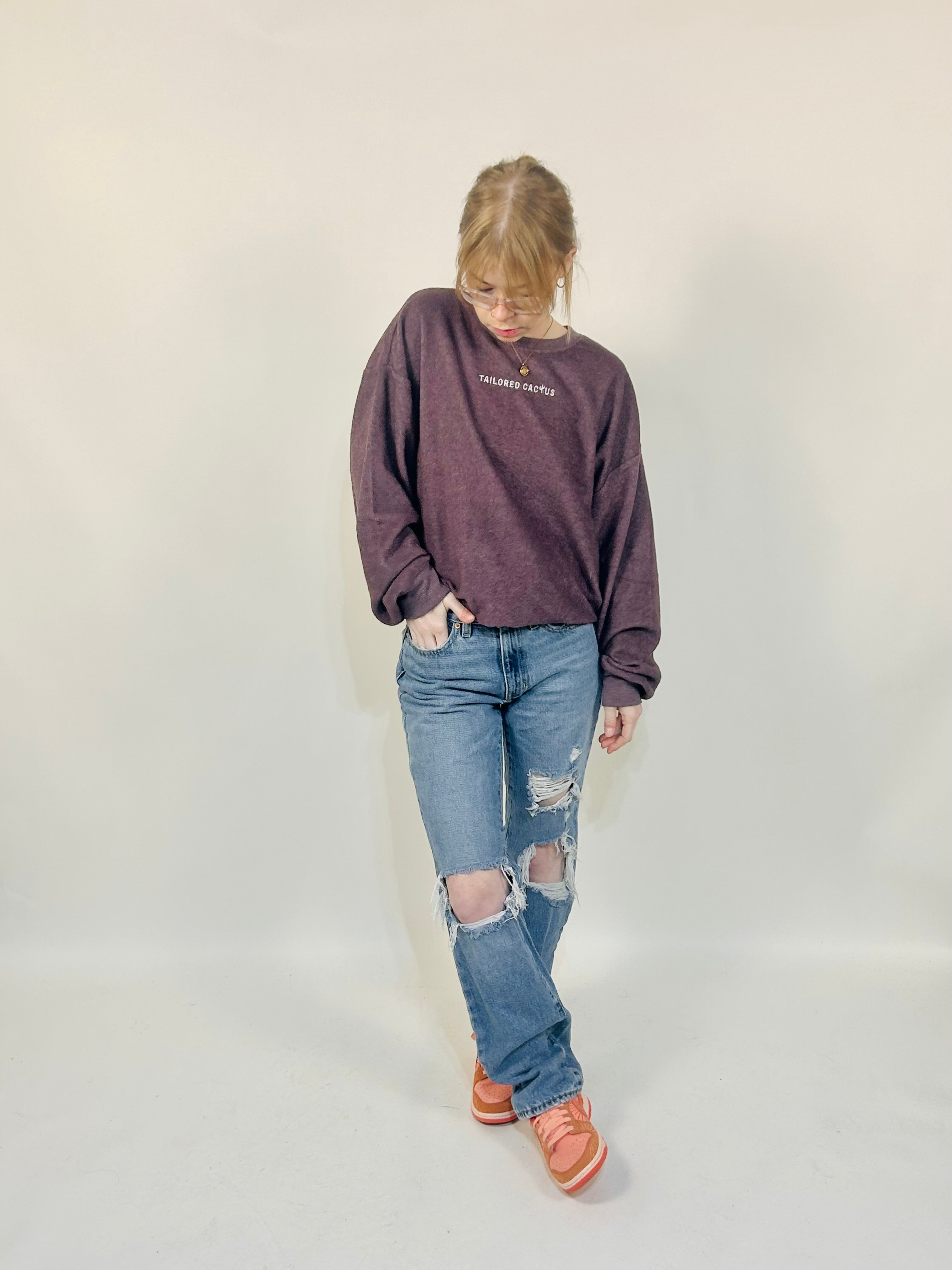 This oversized crewneck sweater is the perfect loose fitted top to add to your wardrobe.